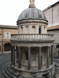 Tag der Open Studios 2017 der Königlich Spanische Akademie in Rom. Künstler und Forscher trafen Fachleuten in ihren Studien um die Werke zu sehen. Die Real Academia de España in Rom ist die maßgebliche Institution für die Pflege der spanischen Kultur in Rom. Die Akademie in der Nähe des Klosters von San Pietro in Montorio (nach dem goldbraunen Boden des Berges: monte d’oro) auf dem Gianicolo-Hügel, von Isabella von Kastilien und Ferdinand II von Aragon, den Katholischen Königen, zwischen 1481 und 1500 gegründet wurde. Im Hof des anstoβenden Franziskanerklosters gibt es von Bramante erbaute Tempietto.